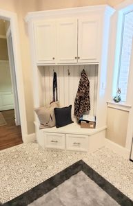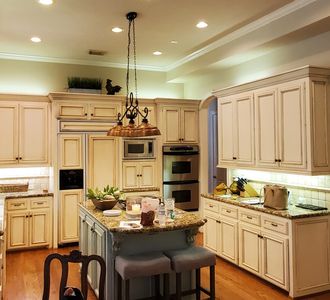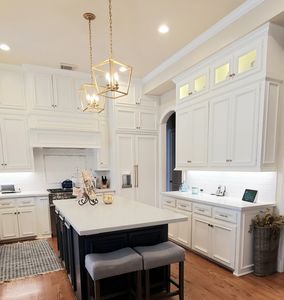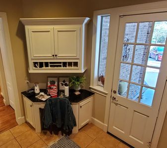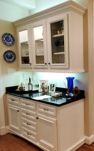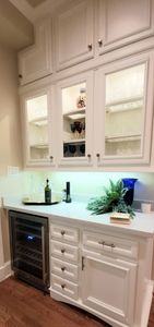 Butler's pantry updated with new custom counter top, in cabinet lighting/ paint, wine fridge below.